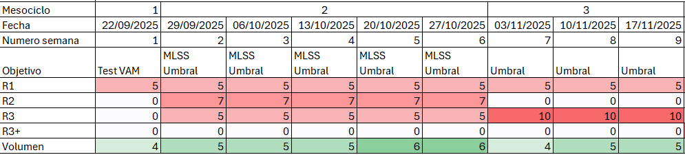 - El trabajo en MLSS o R2 queda acortado a un periodo pequeño de tiempo, será una zona que usemos como adaptación y para relajar la intensidad que nos provocaría un umbral el primer mesociclo.