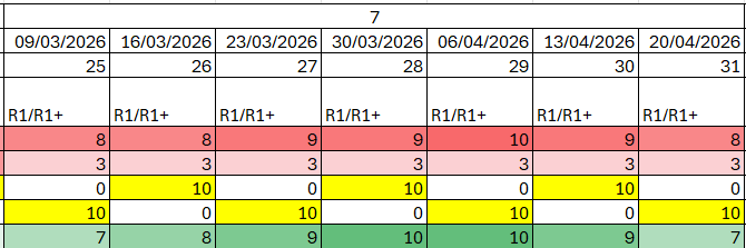 - Los resaltes en amarillo son semanas de recordatorio, donde debemos incluir sesiones en esas zonas para no perder las adaptaciones generadas en el bloque general, no obstante, no son un objetivo de la semana per se.